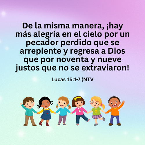 VERSÍCULO PARA MEMORIZAR: “De la misma manera, ¡hay más alegría en el cielo por un pecador perdido que se arrepiente y regresa a Dios que por noventa y nueve justos que no se extraviaron!” Lucas 15:7 [Puede imprimir la siguiente gráfica y entregarla a los niños con el versículo para memorizar.]